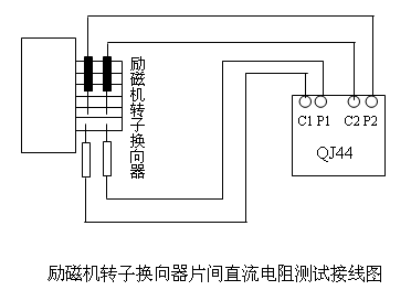 针对用常规方法处理仍然不能解决励磁机电刷火花的问题,后来停机时,用QJ44型双臂电桥测量励磁机转子换向器各相邻两片之间的直流电阻值,如图所示。要注意的是绝不允许在双臂电桥处,用导线将C、P端连接改用两根测试线测量,否则不能消除表笔与换向片间的接触电阻对测量结果造成的影响。