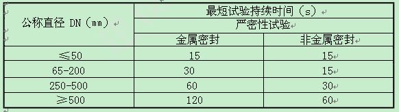 强度试验时,试验压力为公称压力的1.5倍。持续时间不少于5min,阀门的壳体、填料应无渗漏。严密性试验时,试验压力为公称压力的1.1倍;试验压力在试验持续的时间内保持不变,时间应符合下表的规定,以阀辩密封面无渗漏为合格。
