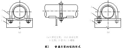根据管道支架的作用、性能要求的不同,结构形式可分固定支架、活动(或称滑动)支架和吊架等,并随管道保温和不保温的要求,又有保温支架和不保温的支架(见图2)。