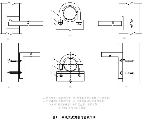 (3)支架安装方法:管道支架安装的时间应在工程主体完工后装修工程施工前进行;常用的安装方法,有预留孔洞埋入、预埋钢板的焊接、射钉及膨胀螺栓和型钢包柱等安装方法(见图4及图5所示)。