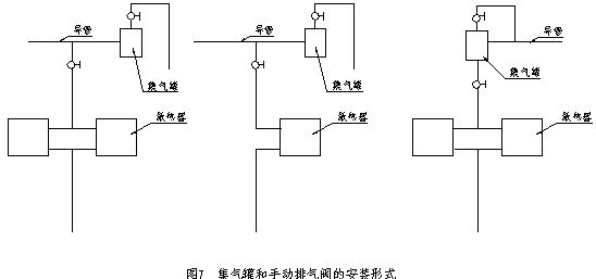 (1)手动排气阀:安装在低中层住宅采暖系统中。一般情况下,集气罐后部应安装主管装置,导管末端与集气罐焊接时,其管底与罐底应取平连接,实际安装方法见7所示。