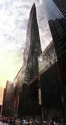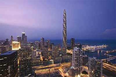 从1973年至今,高1730英尺(约合527米)的芝加哥希尔斯大厦一直独享北美地区第一高楼的头衔。然而,在设计环保的芝加哥螺旋塔竣工后,它将以300英尺之差将这一头衔拱手让出。芝加哥螺旋塔的设计师是著名建筑师圣地亚哥?卡拉特拉瓦(Santiago Calatrava),2004年雅典奥运会主场馆和瑞典HSB旋转中心都出自这位建筑大师之手。卡拉特拉瓦的目标是给芝加哥这座城市夺回一座奖杯:国际绿色建筑认证“领先能源与环境设计”(LEED)金奖。