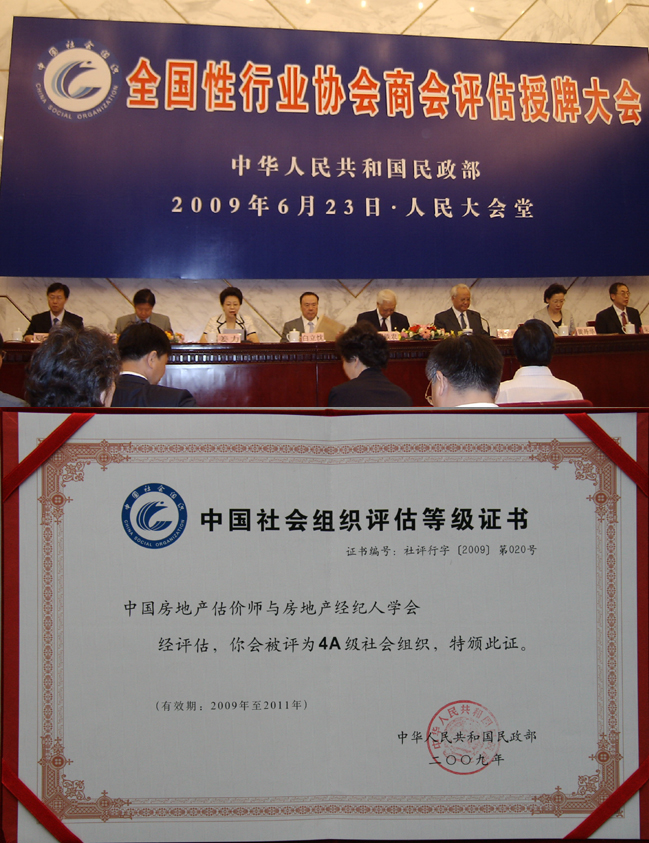 6月23日,全国性行业协会商会评估授牌大会在人民大会堂隆重举行,我会被授予首批4A级全国性行业协会商会。我会是惟一获得该殊荣的全国性评估行业组织,也是住房和城乡建设领域获得4A级以上殊荣的2个行业组织之一。全国人大常委会副委员长周铁农、全国政协副主席白立忱以及国务院有关部委的负责同志出席会议,并向获得3A以上评估等级的全国性行业协会商会颁发牌匾。