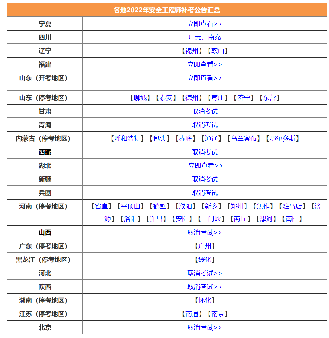 2022年安全工程师补考和取消考试地区,立即查看>>
