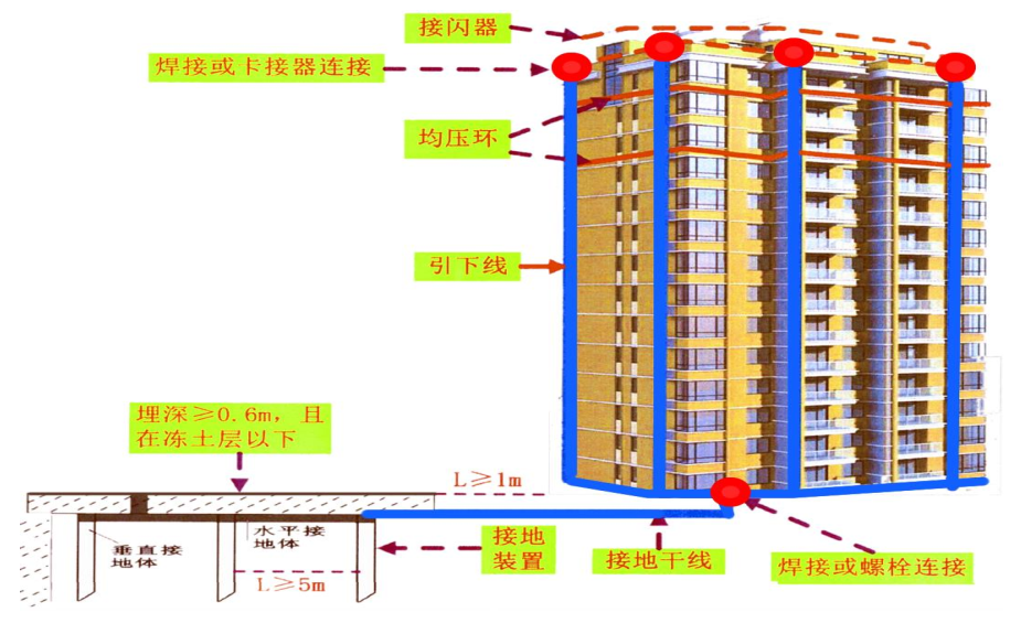 接地装置设置完成一定要对其电阻进行测量,只有保证接地电阻足够小,雷电发生时才能迅速将电流导入大地,保障建筑物安全。