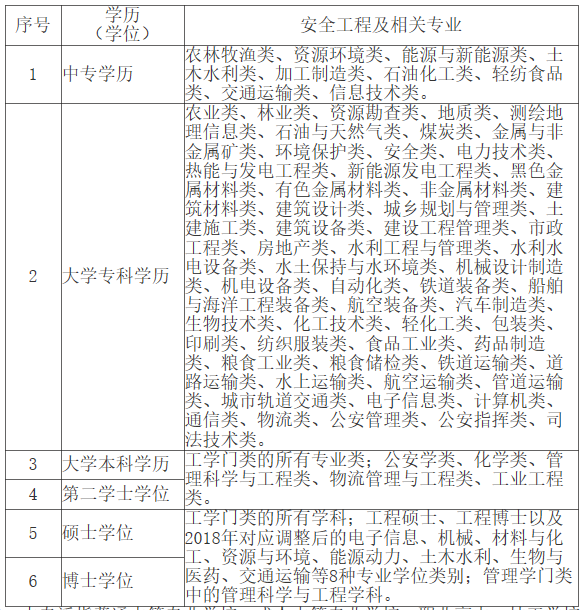1.具有安全工程及相关专业大学专科学历,从事安全生产业务满5年;或具有其他专业大学专科学历,从事安全生产业务满6年。