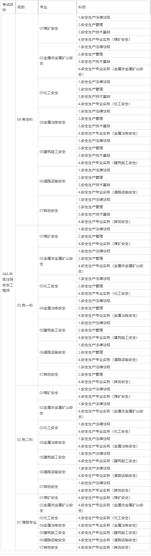 (一)考试科目。考试设4个科目,分别为安全生产法律法规(客观题)、安全生产管理(客观题)、安全生产技术基础(客观题)、安全生产专业实务(主客观题)(详见附件1)。其中安全生产法律法规、安全生产管理、安全生产技术基础为公共科目,安全生产专业实务为专业科目。