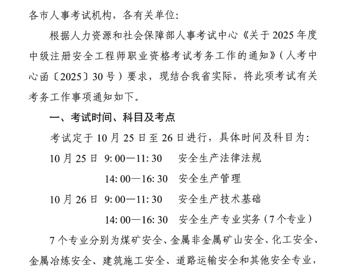 - · 河北2025年中级注册安全工程师考务工作通知 7月30日报名开始