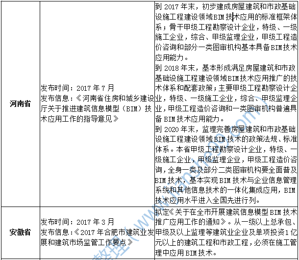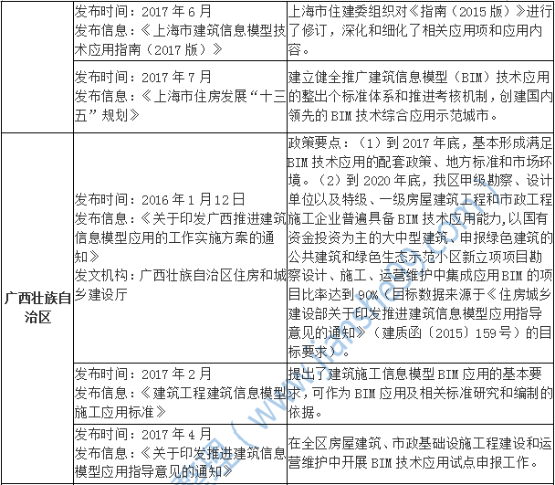2011年住建部发布《2011-2015年建筑业信息化发展纲要》,第一次将BIM纳入信息化标准建设内容,2013年推出《关于推进建筑信息模型应用的指导意见》,2016年发布《2016-2020年建筑业信息化发展纲要》,BIM成为“十三五”建筑业重点推广的五大信息技术之首;进入2017年,国家和地方加大BIM政策与标准落地,《建筑业十项新技术2017》将BIM列为信息技术之首。