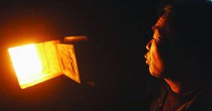 昨日,裕中西里锅炉房,工人师傅吹着炉门中的火焰查看锅炉的运转情况。