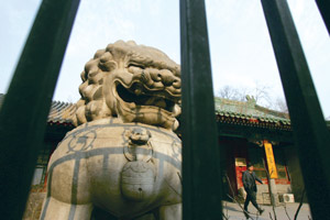王府门口的石狮见证着这座王府的荣辱兴衰。1912年,日本人几乎一次性将恭王府内除字画之外的所有设施、器具掠夺性买走,当时一次流失文物约2000件。本版摄影:本报记者浦峰