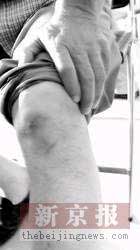 韩某向记者展示腿上的伤痕