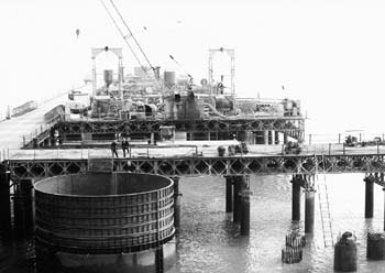 世界最长的跨海大桥——杭州湾跨海大桥施工进入深水作业区,参战的中铁四局集团等单位广泛运用新技术、新工艺、新材料、新设备、新管理,积极加强现场的监控。目前首根超长、超大钻孔桩已经完工,工程建设取得了突破性进展,并为类似工程建设提供了值得借鉴的施工方法。图为大桥施工现场。