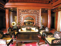据介绍,这座王府大院面积近5000平方米,能同时容纳20人住宿,完全复制当年的王爷生活场景,虽然殿内摆设大部分为仿制品,但件件都价值不菲,如用红木手工雕刻了999条龙的王爷龙榻就价值180万元人民币,已有百年历史的手摇留声机及清朝宫廷绿如意珠帘也都价值连城。王府内的长廊都由穿着绿营军装的侍兵守卫,服务人员也都穿着仿清朝宫廷服饰,“服务沿用清朝的宫廷礼仪,顾客不仅可以享用到满汉全席,还可以体验到当年王爷的待遇。”一位销售人员告诉记者。