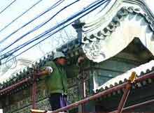 工人正在使房檐恢复原貌。从3月4日开始,东四头条至九条胡同开始大面积的修复