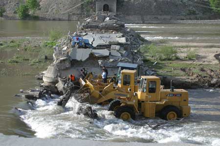 记者于昨日下午6时赶到了岷县县城,记者在现场看到,塌桥的两边站满了公安民警并拉上了警戒线,禁止行人通行。200多米长、8米宽的北门洮河大桥全部坠落河中,3台装载机正在河中清理桥体残骸。
