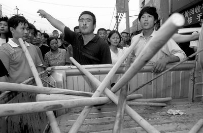 昨天下午6时03分,在真不同饭庄,记者看到众多市民将一辆无牌照微型客货两用车团团围住,有人用脚踹,有人用手敲打车窗玻璃。该车车顶装有扩音喇叭,后车斗内放有10多根锨把。