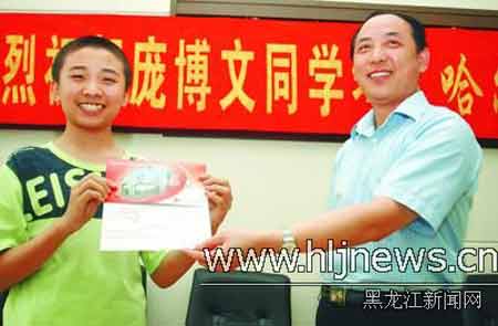 19日下午,当哈尔滨理工大学副校长武俊峰将2006年高考录取通知书递到庞博文的手中时,我省年龄最小的考生,14岁的庞博文以566分的高考成绩成为该校历史上年龄最小的大学生。