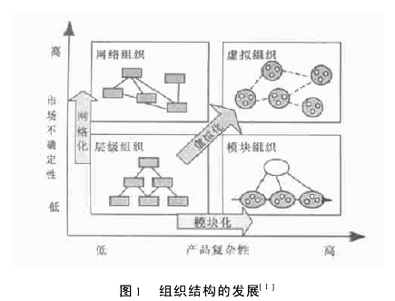 自从20世纪初泰勒的科学管理理论建立以来,传统的强调分工和集权的组织理论也随之形成。但是最近几十年来对于许多组织而言,市场和竞争状况发生了巨大的变化,过去的静态环境已经不复存在。因此,传统的层级组织必须相应地进行变革,以满足动态环境的需求。组织的变革主要包括模块化、网络化以及虚拟化等三个基本策略,它们分别适用于不同的前提条件,如图1所示。