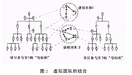 (7)虚拟团队的组合:虚拟团队的成员是来自于各个项目参与方的“母组织”。虚拟团队的成员组合不是基于“母组织”的结构,而是基于所处理任务所需要的能力。根据任务处理的需求,合适的人员将从“母组织”中脱离,并组合为动态的时间上有限的虚拟团队。在成功完成其任务之后,虚拟团队解散,团队成员重新返回到原来的“母组织”。图2说明了虚拟团队的组合。需要说明,这里的虚拟团队1和虚拟团队2可以从事同一个项目,也可以是不同的项目。也就是说,一个项目参与方可以同时参与多个项目,可以是多个虚拟组织的参与方。