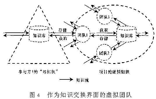 (1)组织结构:项目参与方“母组织”内部运营的组织结构可以是传统的层级结构,而其产生的虚拟团队与其他虚拟团队一起构成了项目的虚拟组织。任何一种组织结构都有其适用范围和优缺点。从知识管理的角度出发,项目参与方“母组织”内部运营的层级结构是长期的稳定的,有利于利用和积累知识;而项目的虚拟组织的结构是短期的不稳定的,有利于分享和创造知识。
