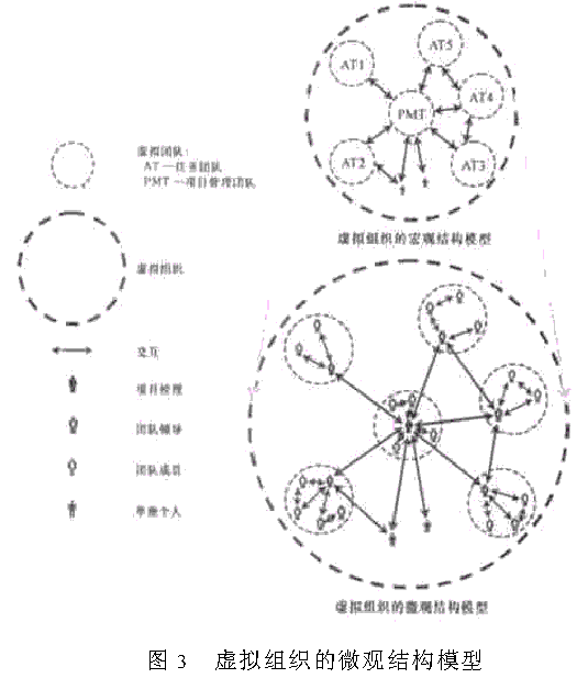 根据以上对虚拟团队的分析,下面的图3给出了虚拟组织的宏观结构模型和微观结构模型。在虚拟组织的宏观结构模型中,该虚拟组织由一个项目管理团队、多个任务团队与多个单独个人组成(比如说是咨询专家),在他们之间存在着团队之间的交互。然后把虚拟组织宏观结构模型中的虚拟团队细化,可以得到虚拟组织的微观结构模型。其中,每个团队都由领导(项目经理或团队领导)和团队成员组成。除了在虚拟组织的宏观结构模型中已经表达的团队之间的交互之外,还可以看到团队内部的交互。由于项目经理和团队领导分别是整个虚拟组织和虚拟团队中的主要协调者,因此其沟通渠道比较集中。另外,图中虚拟团队和虚拟组织的边界都用了虚线,用以说明其边界的模糊性和其构成的动态性。