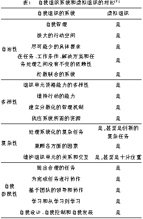 同样的,如果一个组织对外界封闭,则必然会导致活力的丧失,因而几乎所有新的组织理论都把企业描述为一个开放系统。事实上,自我组织在组织理论中并不是一个完全新的概念,诸如自主的工作团队、灵活的工作时间、分散化和代理、以及协作式的领导等等都隐含了自我组织的思想。自我组织的组织系统通常具备高度的灵活性、创造性并且能够在极大程度地激发组织成员的潜力。按照系统论的观点,具备高度开放性和动态性等特征的虚拟组织是典型的自我组织的组织系统。虚拟组织完全符合自我组织系统的四个基本特征,即自治性、多样性、复杂性和自我参照性,如表1所示。虚拟组织中的大多数组织关系其实就是自我组织过程的结果,这种自发的过程很少需要由领导人员去进行有意识的规划和控制,自我组织的组织机制保证了虚拟组织的强大生命力。