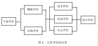方案评价是从许多创造的方案中筛选出一个可行的最佳方案,一般分为概略评价和详细评价。概略评价和详细评价都包括技术评价、经济评价、社会评价和综合评价,方案评价内容如图 2 所示。