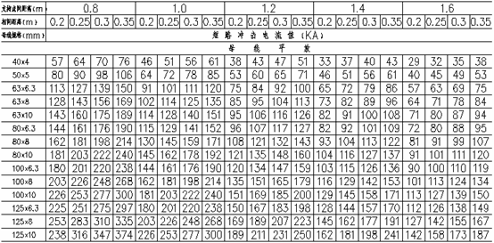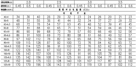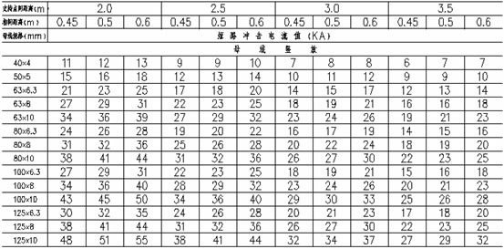 4.按表1选择结果是否能满足额定峰值耐受电流(动稳定电流)的考核?什么叫动稳定电流?是指设备在规定使用条件下,当系统发生短路故障,当短路后半个周期时的全部短路电流的瞬时值,也是短路电流的最大瞬时值,该值等于2.5倍额定短时耐受电流,也称短路冲击电流。根据“工业与民用配电设计手册(第三版)”中的推荐,铜母线允许短路冲击电流,详细在表5-23中列出,现将该表转录于下,供应用参数!