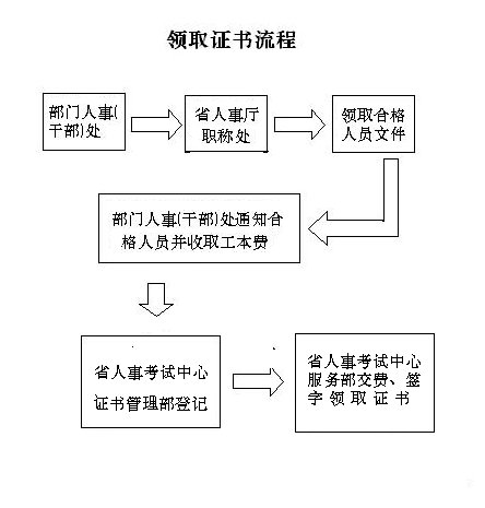 一、 主管部门人事(干部)处负责人(无单位人员直接)到省人事厅职称处领取合格人员文件,负责通知本部门考试合格人员并收取工本费;