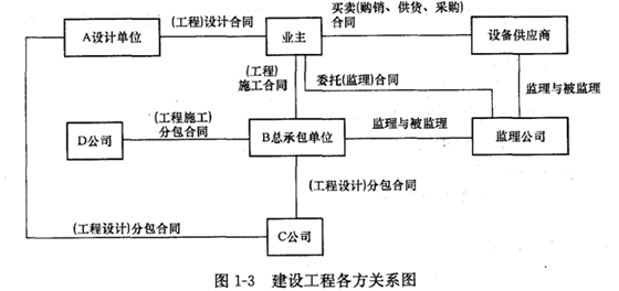 2.在图1-1所示的建设工程各方关系示意图上,标注各方之间关系(凡属合同关系,按《合同法》注明是何种合同关系)。