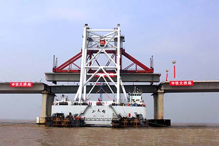 “杭州湾跨海大桥工程规模大、技术含量高、安全风险大,施工时必须面对台风、大浪、潮汐、涌沙等多种复杂气候和水文环境。大桥项目部通过100 多项技术创新,把大部分海上施工转变为陆上作业、大部分高空作业转变为平地作业,避开恶劣环境,大大降低了海上作业的危险性,从而顺利提前完成了70米箱梁的全部架设。”中铁大桥局股份公司总经理、杭州湾跨海大桥项目部指挥长谭国顺说。