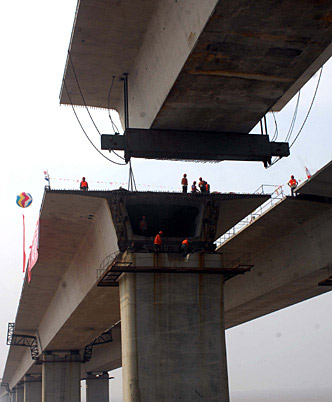新华社浙江海盐5月21日电21日9时30分,全长36公里的杭州湾跨海大桥最后一片70米箱梁精确落位,标志着这座世界最长的跨海大桥全桥上部混凝土结构施工全面完成。