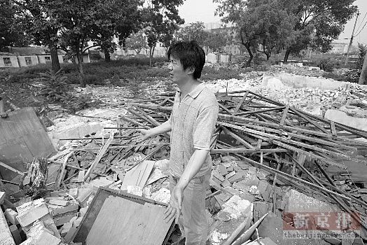 昨日,孟女士上班后住房被夷为平地,其哥哥站在废墟上表示无奈。本报记者韩萌摄