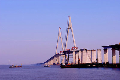 据介绍,大桥建设创造了多项世界或国内第一:杭州湾跨海大桥全长36公里,其长度在目前世界上在建和已建的跨海大桥中位居第一;在国内第一次明确提出了设计使用寿命大于等于100年的耐久性要求;架设运输重量从900吨提高到1430吨,到目前为止居世界第一;在国内第一次成功实施了“二次张拉技术”;采用整桩螺旋钢管桩,最大直径1.6米,单桩最大长度89米,整桩螺旋钢管桩长度在国内外桥梁钢管桩中位居第一;在滩涂区的钻孔灌注桩施工中,第一次采用有控制放气的安全施工工艺,这一施工工艺在世界同类地理条件中尚属首创。