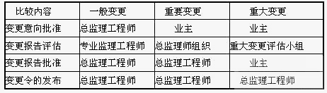 一般变更是指一定限额以下的设计差错、设计遗漏。如材料代换以及现场必须作出决定的局部修改等。与重要变更相比,一般变更处理权限有所区别,一般变更处理权限分别为:变更意向由总监理工程师批准,变更报告由专业监理工程师评估,变更报告批准及变更令的发布均由总监理工程师进行。三种不同变更的审批权限比较见表1.