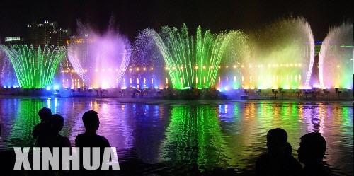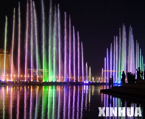资料图片:这是吉林市2004年在松花江上建起的272米长的漂浮式七彩音乐喷泉。新华社发(朱万昌摄)