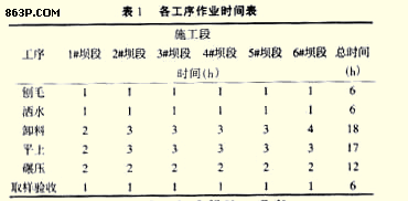 按同样的方法计算洒水与卸料两队开工间隔K2=max{1,2,-2,-4,-5,-8,-18}=1(h);卸料与平土开工间隔K3=max{2,3,3,3,3,4,-17}=4(h);平土与碾压开工间隔K4=max{2,3,4,5,6,7,-12}=7(h);碾压与验收开工间隔K5=max{2,3,4,5,6,7,-6}=7(h)。