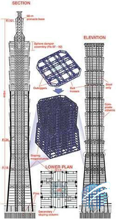 为了使从未实现过的外斜7°的结构可以成真,在玻璃帷幕墙使用特殊设计的框架,每八楼为一模组,能兼有支撑楼地板重量的作用,且为了应付地震与颱风的摇晃,该框架具有弹性。