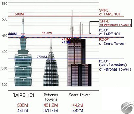 TAIPEI 101高达508M,是在PT之后第一个成为世界第一高的摩天大楼,也是21世纪第一座世界第一高的摩天大楼,更是世界上首度超越500M的摩天大楼。毫无疑问的,TAIPEI 101的第101层即超越Sears Tower,达到448M的高度,上面的尖塔顶端高达508M,自然也远远超越 Petronas Towers,不管怎么比,都是世界第一高。