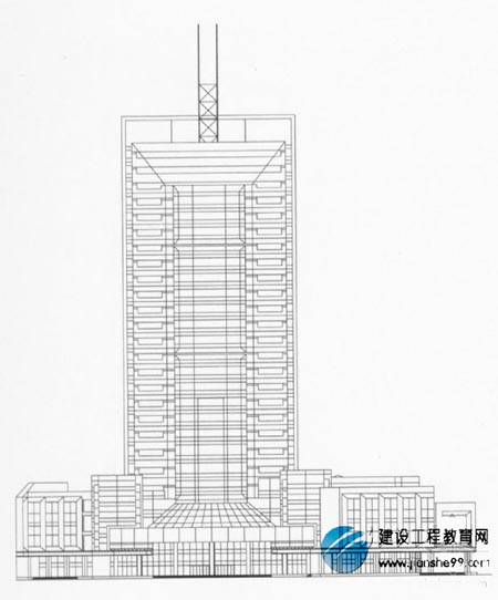 南通市七彩综合大厦代表了南通市建设银行的形象.银行拥有的财富、资金是各个行业运营的基础。立面设计考虑西北角的主楼造型近似“金锭”.两侧裙房排列成有韵律的“金锭”组合体,与主楼上下呼应。