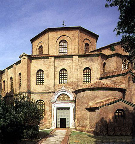 主要特征:中堂由8个由半圆拱券联系在一起的柱垛围合而成,柱垛间的柱子按凸出的半圆形排列,形成花瓣形中堂。中堂上部是八角形的空心砖砌穹顶,其上有架在木屋架上的八角形坡屋顶。侧廊为八角形平面,竖向为两层,外墙直接反映了侧廊的平面形状,整个建筑形体具有高度的向心性。圣维塔莱教堂中的柱子大多采用了双层柱头,其缘由众说不一。教堂的室内采用了大理石和玻璃马赛克进行装修,柱头部分镂空雕刻,无论从色彩还是从马赛克壁画的题材方面都具有拜占庭建筑梦幻般华丽的风格,有“西方的圣索菲亚”之称。