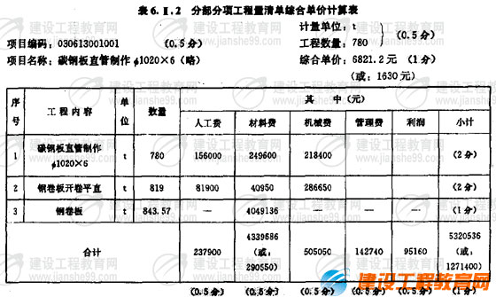 (4)承包人应该向发包方计取的该项钢板卷管制作分部分项工程量清单费用数额。依据《建设工程工程量清单计价规范》《全国统一安装工程预算定额》的有关的规定,计算出Φ1020×6碳钢板直管制作(清单项目的统一编码为030613001)的分部分项工程量清单综合单价,将相关数据填入答题纸表