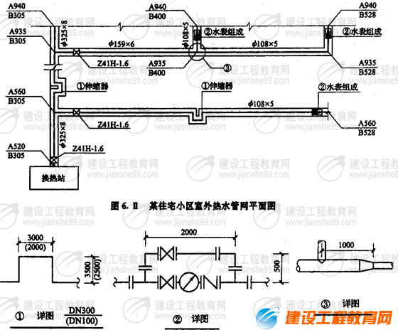 1.本图所示为某住宅小区室外热水管网平面布置图.该管道系统工作压力为1.0MPa.热水温度为95℃.图中平面尺寸均以相对坐标标注.单位以m计,详图尺寸以mm计。