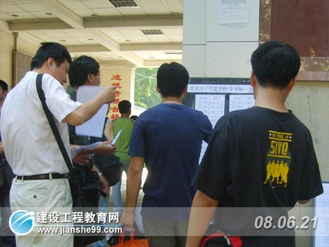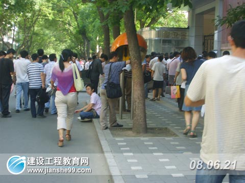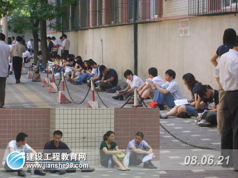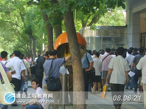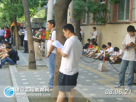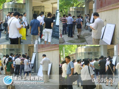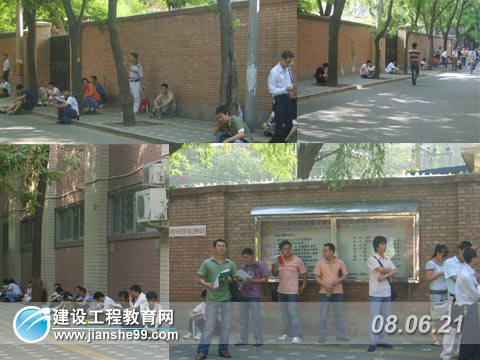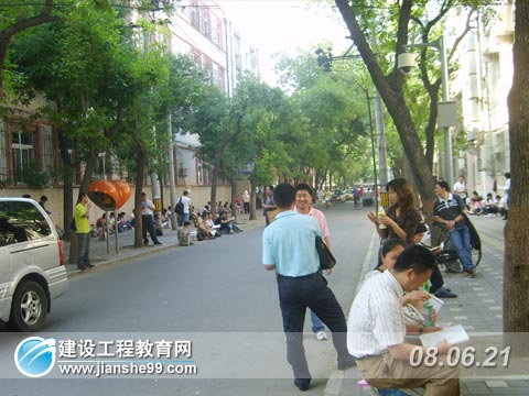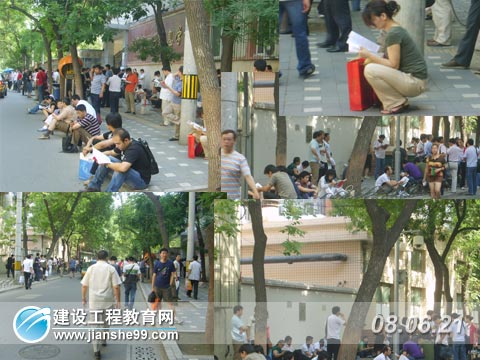建设工程教育网6月21日讯 今天(2008年6月21日),2008年全国二级建造师考试如期举行(除四川延考外),这是本年度建筑类上半年考试中的最后一类,而且二级建造师的从业人群是非常多,地震的发生,对工程质量的把关更加严格,所以获得执业资格尤为重要。考试在9点准时举行,各个考点外已经站满了考生,有的在考点外和同考的人互相交流着,有的考生则在考点外进行最后的冲刺准备,建设工程教育网记者也奔赴各考点,进行追踪报道。