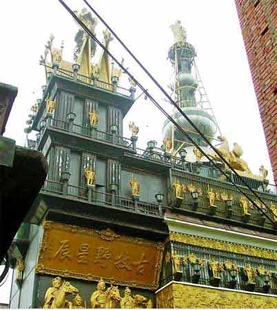 李军告诉记者,这些塑像以及牌匾全部都是用黄铜做的,下面白色的外墙则是汉白玉,整个建筑因此看起来金碧辉煌。