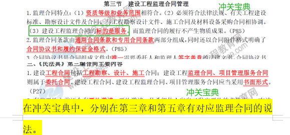 在冲关宝典中,分别在第三章和第五章有对应监理合同的说法。