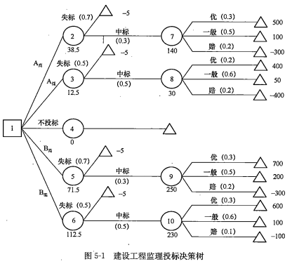 工程监理单位根据过去承担过的类似工程数据进行分析,得到每种方案的利润和出现概率见表5-6。如果投标未果,则会损失5万元(投标准备费)。
