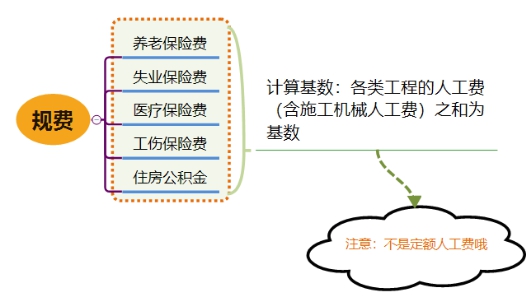 规费指按法律、法规、规章、规程规定施工企业必须缴纳的费用。个人缴纳部分含在个人工资中。企业管理费中基本费用包括的管理人员所缴纳的“四险一金”不含在规费中,规费只是给生产工人缴纳的“四险一金”。