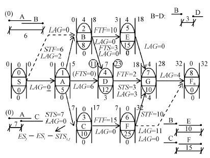 (2)计算相邻工作之间的时间间隔,有搭接关系的LAGi,j计算公式: